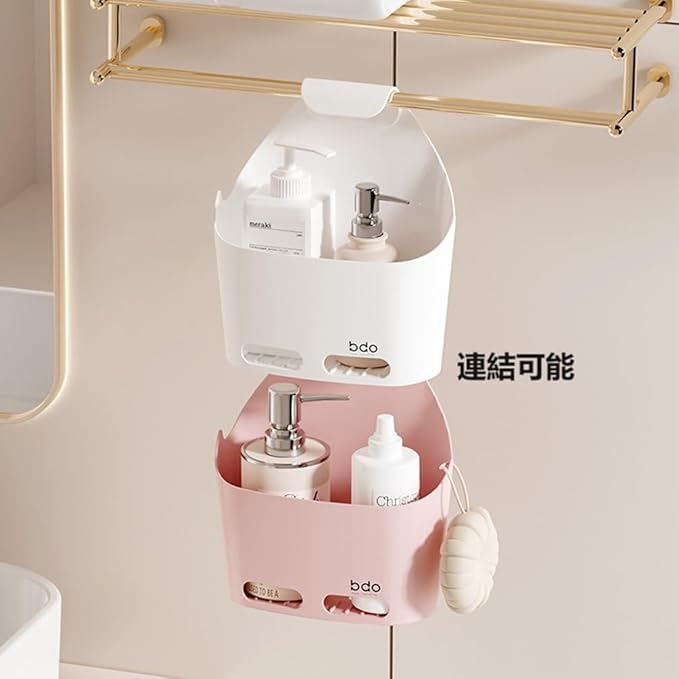 【省スペース】引っ掛けて使用できるバスケットで、連結してのご使用も可能で、タオルバー、浴室扉のハンドルになどに引っ掛けたり、限られたスペースを有効活用できます。ボトルやスポンジ、おもちゃなどをまとめてスッキリ収納できます。