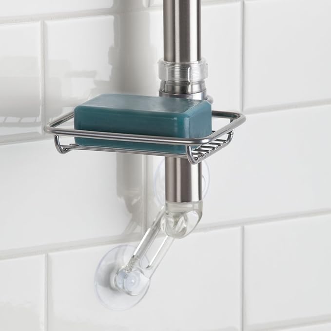 InterDesign フォーマ(Forma)シャワーキャディーは、調節可能な収納バスケット2つと石鹸置き、タオルバー付きで、モダンなマットフィニッシュのデザインです。金具なしで設置可能。シャワーヘッドに掛けて、タイルの目地に当たらないようにした部分の吸盤カップで固定するだけで、簡単に設置できます。