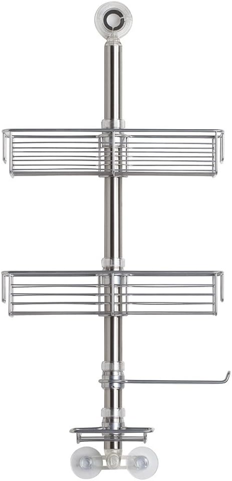 調節可能な収納バスケット2つと石鹸置き、タオルバー付き。バスケットを上下に調節して背の高いボトルも収納可能。