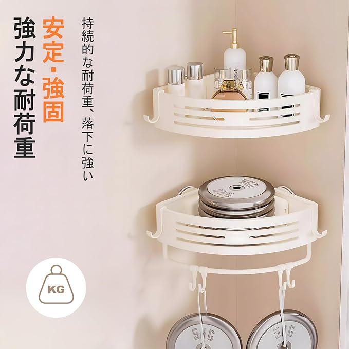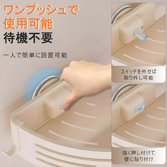 【ワンタッチ設置&強力吸盤】 打孔不要!TPE高分子素材+真空排気ボタンによる二重吸着技術で、タイル/ガラス/大理石など平滑な壁面にしっかり固定。取り外しも簡単で壁に痕跡残らず、繰り返し使用可能です。収納ラックとして浴室・洗面所に最適。