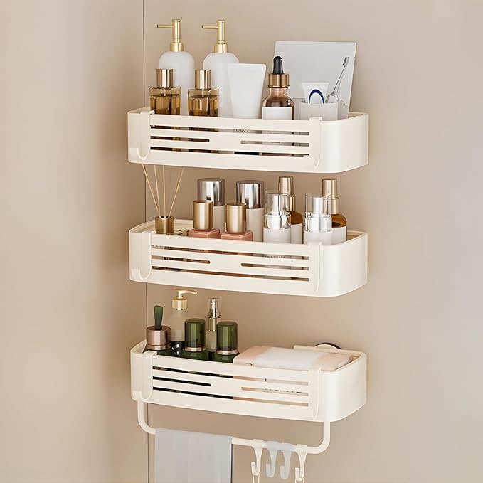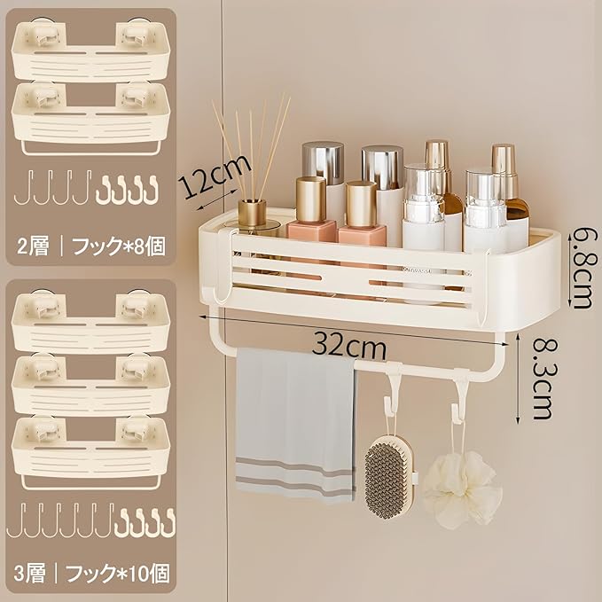 Reelyo 吸盤 浴室用ラック バスラック 浮かせる収納 水切り 防水と防錆 フック/タオルバー付き バスルーム/お風呂/洗面所/キッチンに おもちゃ シャンプー 収納 (3段)