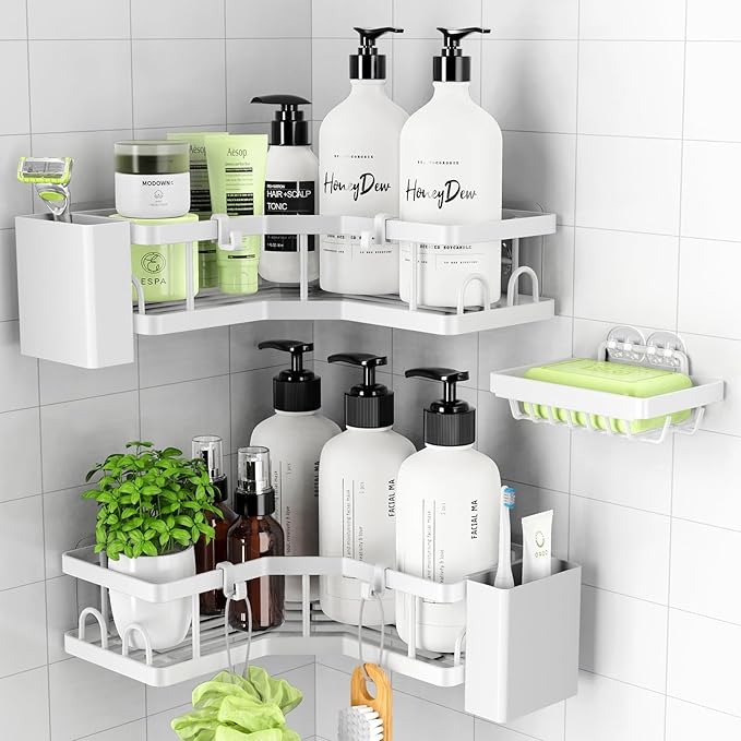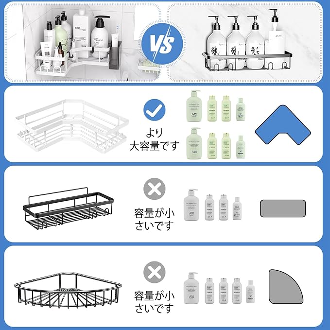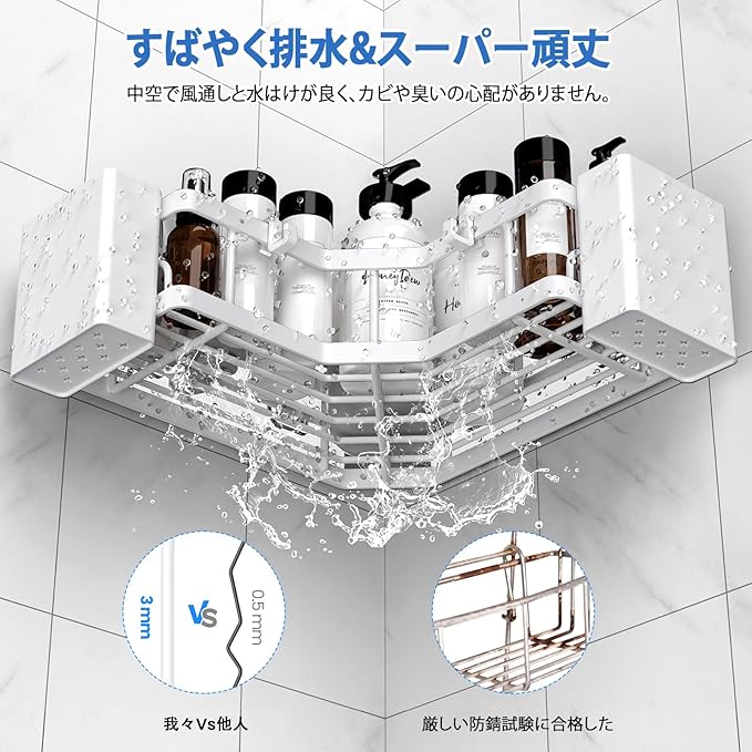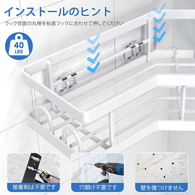 【長持ちします】太い鋼鉄材料、精密な溶接技術により、強い耐荷重能力を持っています。当社の製品は丈夫で長持ちします。高粘度フックも付属しており、シャワーラックの位置を移動するのに便利です。