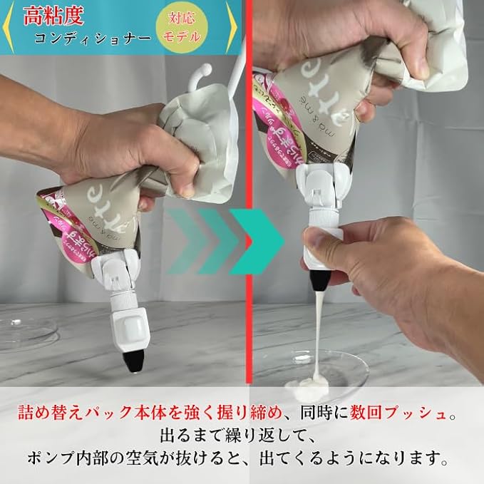 ①【簡単便利】 面倒な詰め替え作業不要。 詰め替えパックを簡単セットするだけでそのまま使える。 シャンプーリンスなどの詰め替えパックに取り付けることで使用することができる。