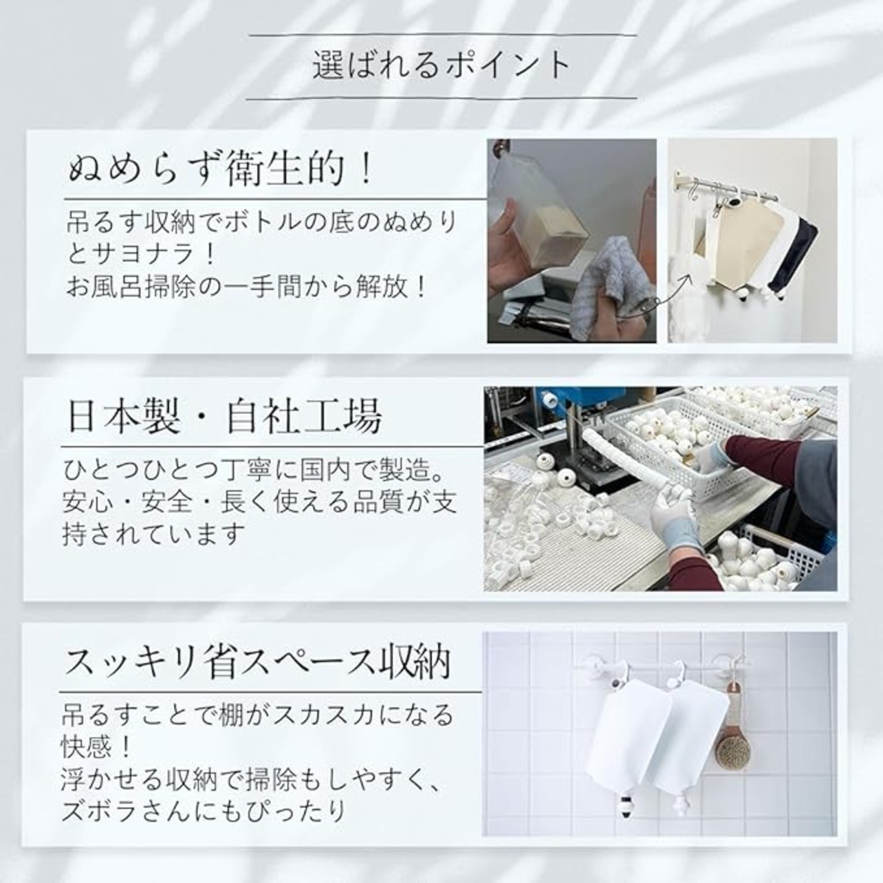 「1」【簡単ワンタッチ】 今まで面倒だった詰め替え作業がなくなりました。 詰め替えパックを簡単セットするだけでそのまま使えます。 シャンプーリンスなどの詰め替えパックに取り付けることで使用することができます。 「2」【品質劣化を防ぐ逆支弁構造】 逆止弁構造で、空気の逆流を防ぎ酸化防止になります。 真空状態を保つことで、雑菌の繁殖を防ぎます。 「3」【最後まで使える経済性】 ぶら下げて使うことで、最後の最後まで洗剤を使えます。 「4」【ボトルが不要でゴミが削減される】 ボトルを使わなくてすむので、お風呂場がスッキリします。 「5」【誰でも簡単ワンプッシュ抽出】 片手で適量が抽出でき、赤ちゃんとの入浴時にも便利です。 ★抽出量:ミニシリーズは3~4ml スタンダードは5~6ml ★耐荷重:4~5kg