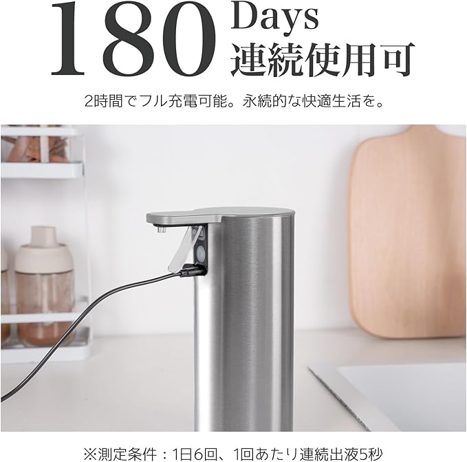 【充電2時間|半年間の持続動作を実証】超省エネ設計で充電2時間=約180日使用可能(1日6回・5秒/回測定)。業界初の長期持続自動ソープディスペンサーで、煩わしい充電から解放。