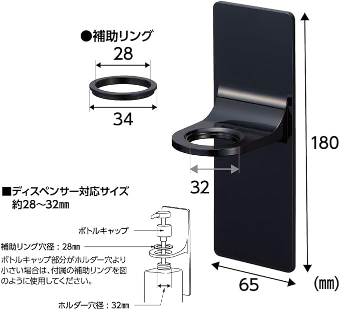 【穴径】ホルダー穴径:32mm 付属リング穴径:28mm 対応サイズ:約28~32mm(ボトルキャップ部分がホルダー穴より小さい場合は、付属の補助リングをご使用ください。) ※対応サイズの範囲内でも形状によっては取り付けられない場合があります。【耐荷重】1.5kg
