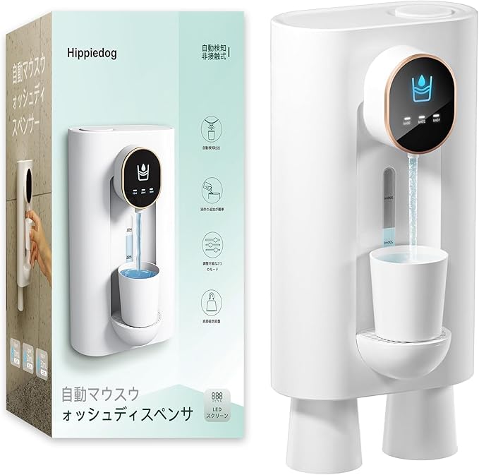 Hippiedog 自動マウスウォッシュディスペンサー 540ml大容量 バスルーム専用 1200mAh充電式 壁掛け式マウスウォッシュ 詰め替え容器 磁気コップ4つ 3段階三吐出量調整可能 【10ml/20ml/30ml】 子供と大人適用 マウスウォッシュ 自動ディスペンサー 日本語説明書付