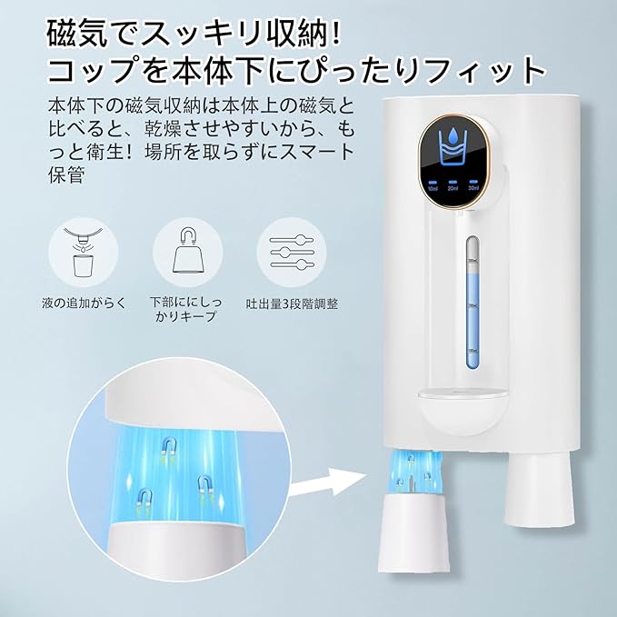 【スタイリッシュで便利なデザイン】このマウスウォッシュディスペンサーは、バスルームのスペースを節約しながら、スタイリッシュな外観でバスルームの雰囲気や生活の品質を向上させます。磁気コップのデザインにより、液の残留を防ぎ、常に清潔で衛生的な使い心地をお楽しみいただけます。