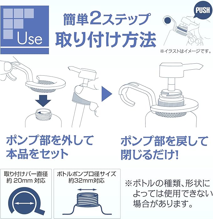 <取り付け方法>①ボトルのポンプ部分を取り出し、ボトル口に本品をセットします。②そのままポンプ部分を戻し、本品を固定するようにキャップをしっかりと閉めてください。