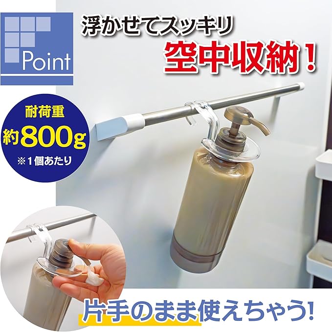 【ボトルのお悩みもコレで解決!】ボトルを空中に浮かせるので、カビやボトル底のヌメリ対策できます!使うときに倒しちゃう...ボトルの底がヌメヌメに...お掃除のときに邪魔...。こんな浴室のお悩みに!邪魔なボトルをオシャレに空中収納できちゃいます!