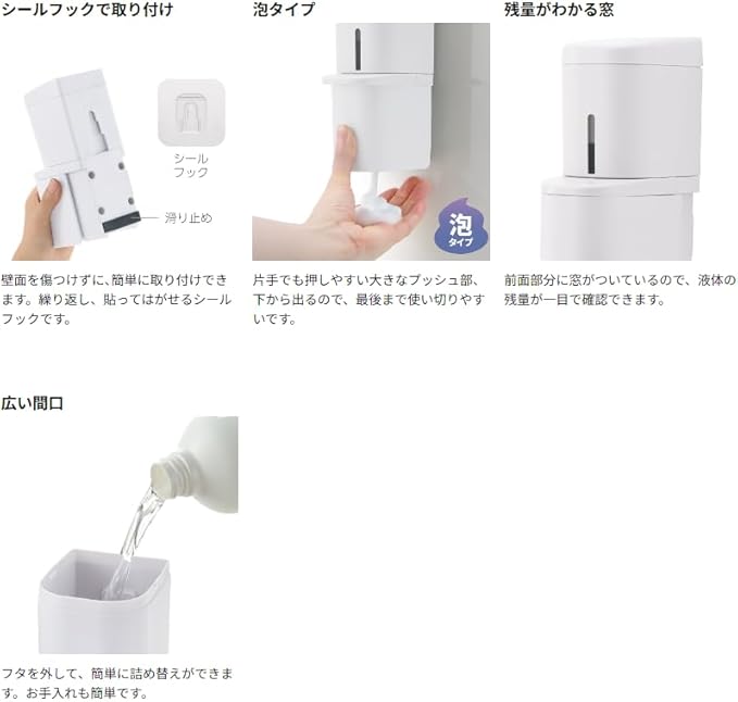 シールフックで取り付ける泡タイプのディスペンサーです。