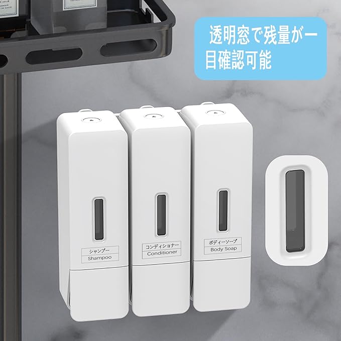 大容量設計で便利設計で、340mlの大容量を実現。シャンプー、ボディーソープ、コンディショナーなど、さまざまな洗浄剤を同時に収納可能。家庭はもちろん、ホテル、美容院、病院、公共トイレなど、多様なシーンで活用でき、詰め替え頻度を大幅に削減。大容量だから、忙しい日常でも安心して使用できます。