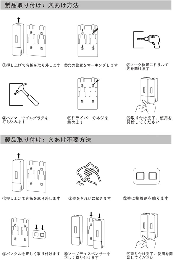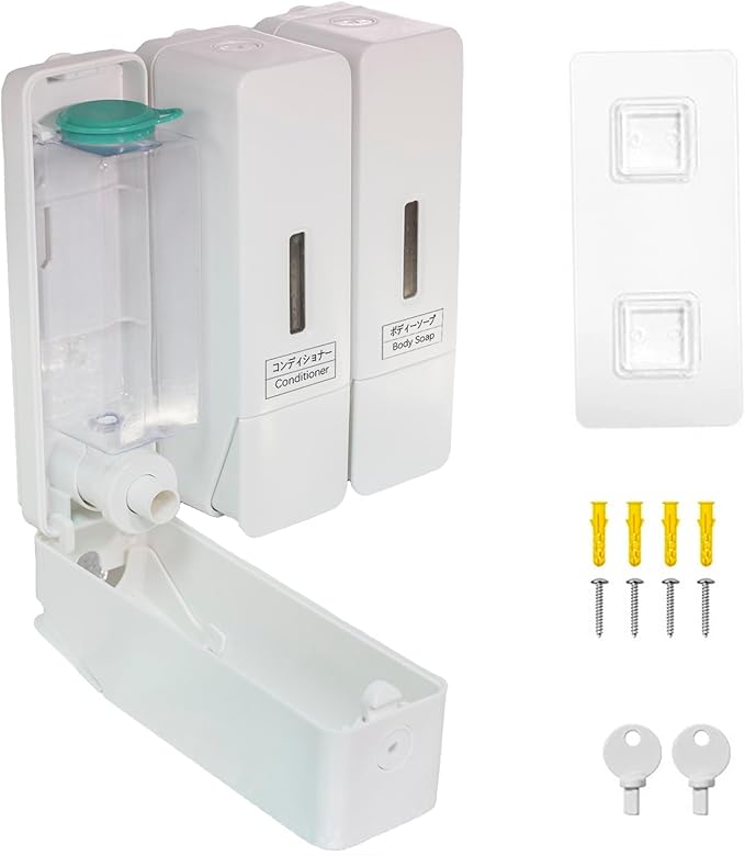 大容量ソープディスペンサーは、シャンプー、ボディーソープ、コンディショナーなど、さまざまな洗浄剤を同時に収納できる便利なアイテムです。各室340mlの大容量を誇り、家庭はもちろん、ホテル、美容院、病院、公共トイレなど、多様なシーンで活用できます。詰め替え頻度を大幅に削減し、忙しい日常でも安心して使用できる設計です。 使用上の注意: 無痕テープの取り付けに適した壁面タイプ: a. 滑らかなタイル/大理石 b. 硬質で滑らかなガラス c. 滑らかな金属 d. 滑らかな浴室用ミラー 無痕テープの設置に適さない壁面タイプ: a. コンクリート壁面 b. 壁紙壁面 c. 凹凸のある木目壁面 d. 凹凸のある金属壁面 e. 塗装壁面 f. 凹凸のあるタイル壁面 g. 珪藻土壁面 h. 凹凸のある大理石壁面 取り付け前に壁面の清掃を行い、接着面を乾燥させてから設置してください。 高粘度の液体を使用する際は、ポンプの詰まりを防ぐため、定期的にポンプ部分を清掃してください。 無痕テープを使用する場合、設置後24時間は荷重をかけないようにしてください。 このソープディスペンサーは、家庭から商業施設まで幅広く活用できる便利なアイテムです。大容量で詰め替えが簡単、耐久性も抜群で、長期間にわたって快適に使用できます。ぜひこの機会にご検討ください! よくあるご質問 Q:初回ご使用時にボタンを押しても液が出ません A:内部に空気が残留している状態です。排出穴を指で塞ぎながら数回ボタンを押す操作をお試しください。これで排液不良が解消されます。