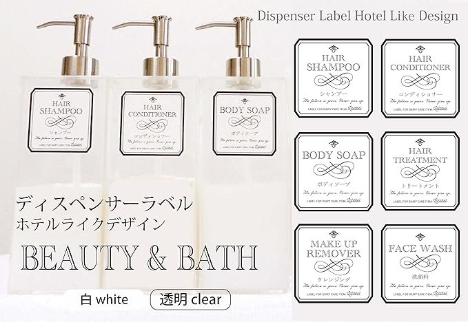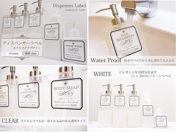 LALABEL<ディスペンサーラベル>シャンプーボトル他ラベル12枚 ホテルライクデザイン… (WHITE+W防水)
