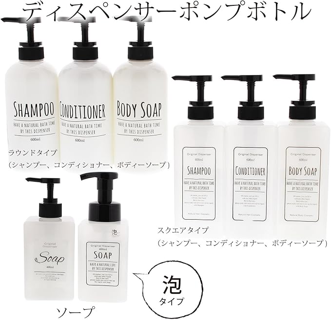 リビング ディスペンサー ポンプボトル スクエア シャンプー&コンディショナー&ボディーソープ ホワイト 600ml 3個 ソープボトル 400ml 1個 (泡タイプ) 、計4個セット