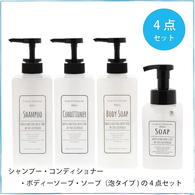 セット内容:シャンプーボトル 1個、コンディショナーボトル 1個、ボディソープボトル 1個、ソープボトル(泡タイプ) 1個
