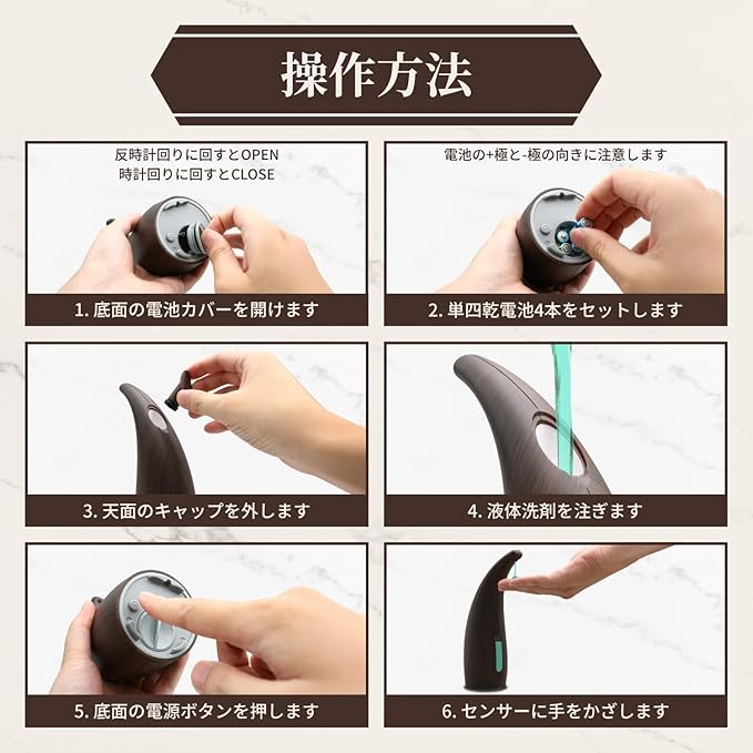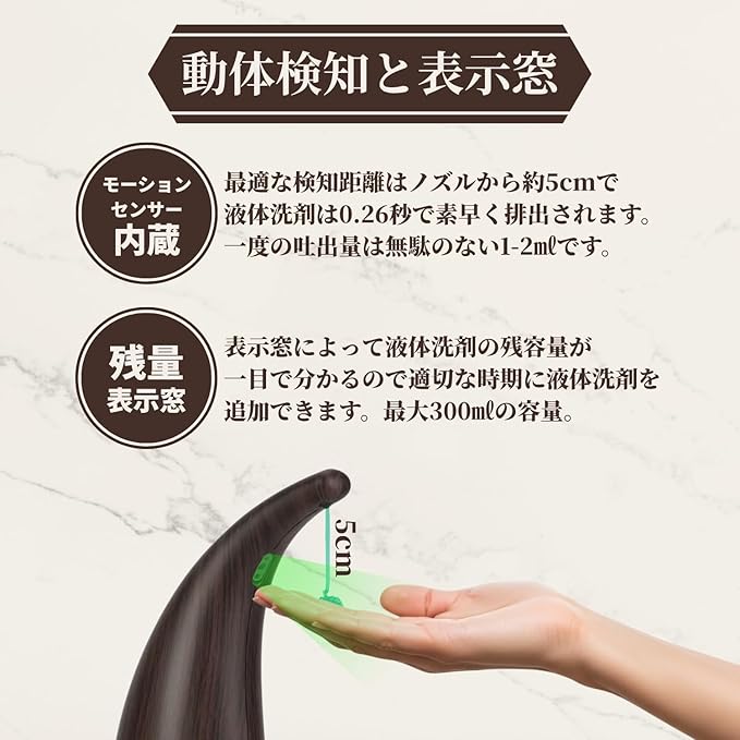 滑らかなカーブを描くスタイリッシュボディにモーションセンサーを内蔵。たっぷり300mlの容量。表示窓で液体洗剤の残量を一目で確認できます。
