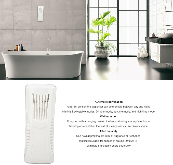 自動芳香剤ディスペンサー 80ml 光センサー 壁掛け式 家庭用 ホテル オフィス 単3電池2本駆動 バスルーム レストラン用