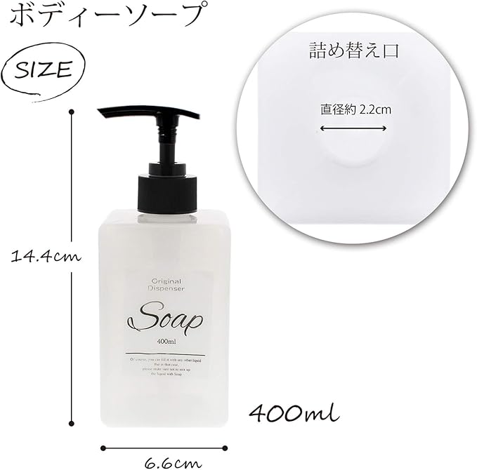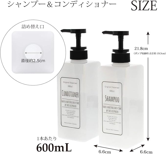 本体サイズ:(スクエアボトル)約6.6 6.6 21.8cm、ポンプ収納時の高さ:約19.3cm(1個あたり)、(ソープボトル)約7 7 17cm、ポンプ収納時の高さ:約15cm