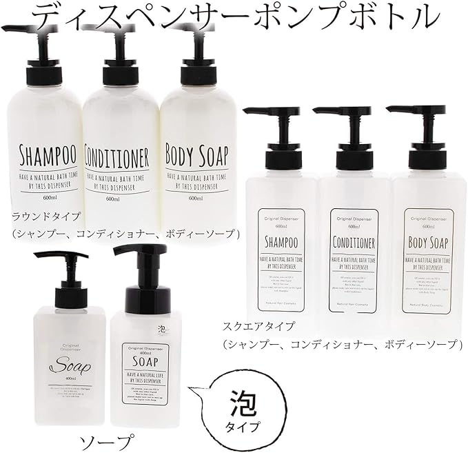 リビング ディスペンサー ポンプボトル スクエア シャンプー&コンディショナー ホワイト 600ml 2個 ソープボトル 400ml 1個 (レギュラータイプ)、計3個セット