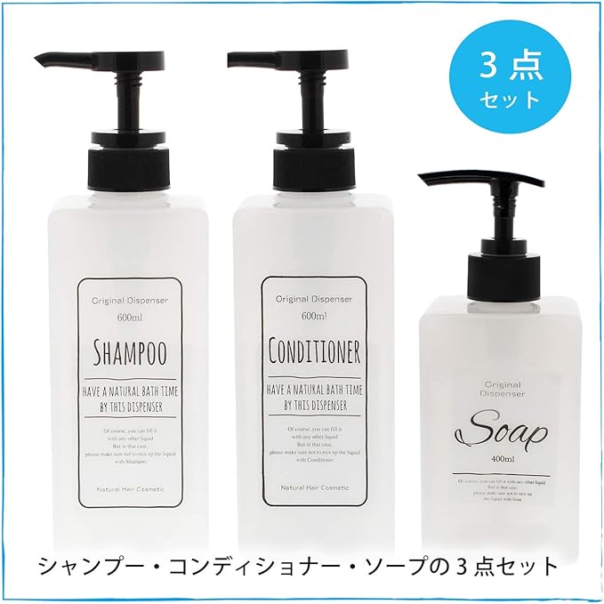 セット内容:シャンプーボトル 1個、コンディショナーボトル 1個、ソープボトル(レギュラータイプ) 1個