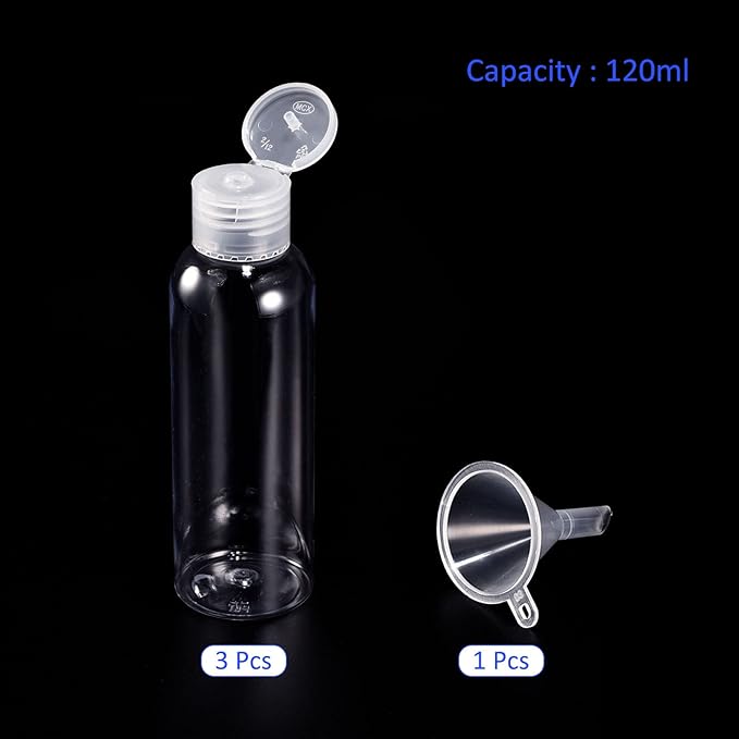パッケージに含まれるもの:3個のトラベルボトルと1個の漏斗、ボトルのサイズは41mm x 110mm / 1.61" x 4.33"(直径 高さ)で、容量は120mlです。漏斗の底のサイズは6.6mm x 18mm / 0.26" x 0.71"(直径 高さ)で、漏斗の上部の直径は30mm / 1.18"、高さは40mm / 1.57"です。