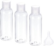 3個のトラベルボトルと1個の漏斗、ボトルのサイズは41mm x 110mm / 1.61" x 4.33"(直径 高さ)で、容量は120mlです。漏斗の底のサイズは6.6mm x 18mm / 0.26" x 0.71"(直径 高さ)で、漏斗の上部の直径は30mm / 1.18"、高さは40mm / 1.57"です。