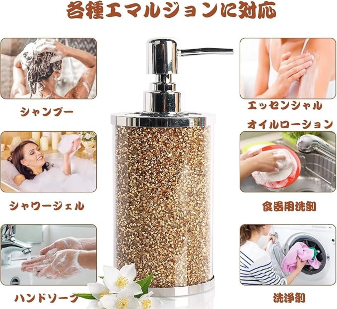 【多用途】ガラスソープディスペンサーは、洗濯室、またはシンクの隣で使用できます。液体石鹸、食器用洗剤、ローション、エッセンシャルオイル、シャンプー、ボディウォッシュ、マウスウォッシュなどに最適です。 クリスタルが輝くハイエンドファッションは、アートと人生の完璧な組み合わせです。