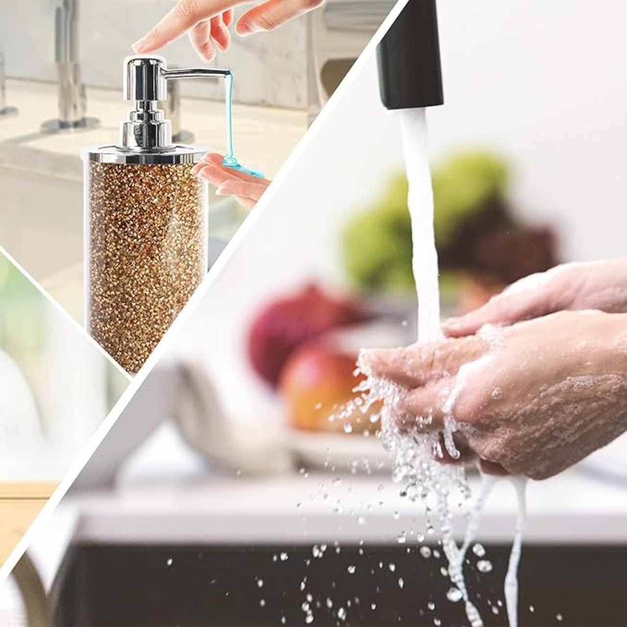 【Home Essentials】ハンドサニタイザーソープディスペンサーは、カウンタートップ、バスルーム、オフィスに設置できます。 ローションソープディスペンサーをデコレーションとして使用することもできます。 光の下でキラキラと輝きます。 バスルームや化粧台用の本当に素晴らしいアクセサリーです。