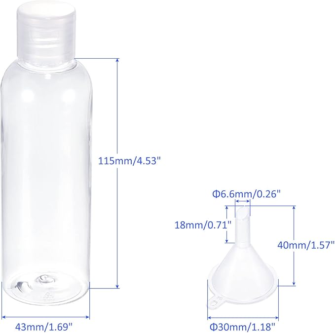 パッケージに含まれるもの:トラベルボトル6個と漏斗1個、ボトルのサイズは43 mm x 115mm / 1.69" x 4.53"(直径 高さ)、容量は150ml、漏斗の底のサイズは6.6mm x 18mm / 0.26" x 0.71"(直径 高さ)、漏斗の上部の直径は30mm / 1.18"、漏斗の高さは40mm / 1.57"