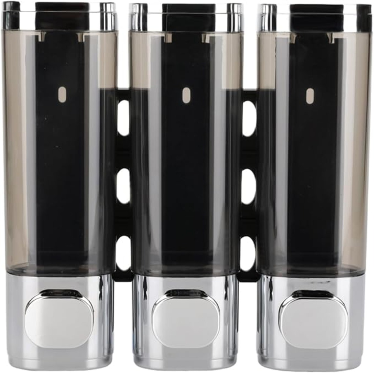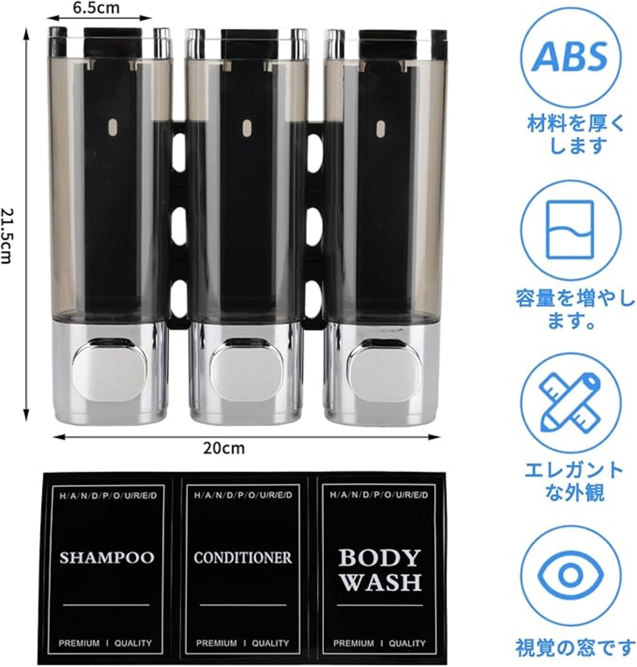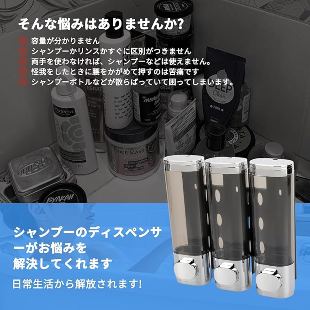 スタイリッシュで使いやすい壁掛け式シャンプーディスペンサーです。3連タイプで、シャンプー、コンディショナー、ボディーウォッシュを一括収納できます。各ボトルの容量は300mlで、透明な本体により残量が一目で確認できます。高品質なABS素材を使用し、耐久性に優れています。片手でも簡単に操作できる押しボタン式で、濡れた手でも扱いやすい設計です。浴室の壁面に強力マグネットで取り付けられ、安定した設置が可能です。ボトルの幅は6.5cm、高さは21.5cm、3連での全長は20cmとコンパクトなサイズです。エレガントなデザインで、モダンな浴室にマッチします。清潔感のあるクリアボトルとシルバーの組み合わせが、バスルームを上質な空間に演出します。