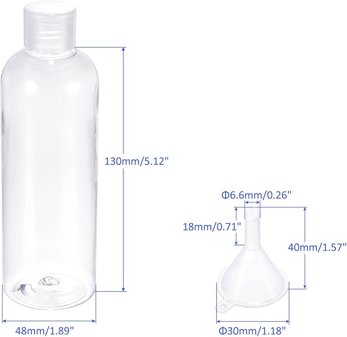 パッケージに含まれるもの:6個のトラベルボトルと1個の漏斗、ボトルのサイズは48mm x 130mm / 1.89" x 5.12"(直径 高さ)で、容量は200mlです。漏斗の底のサイズは6.6mm x 18mm / 0.26" x 0.71"(直径 高さ)で、漏斗の上部の直径は30mm / 1.18"、高さは40mm / 1.57"です。