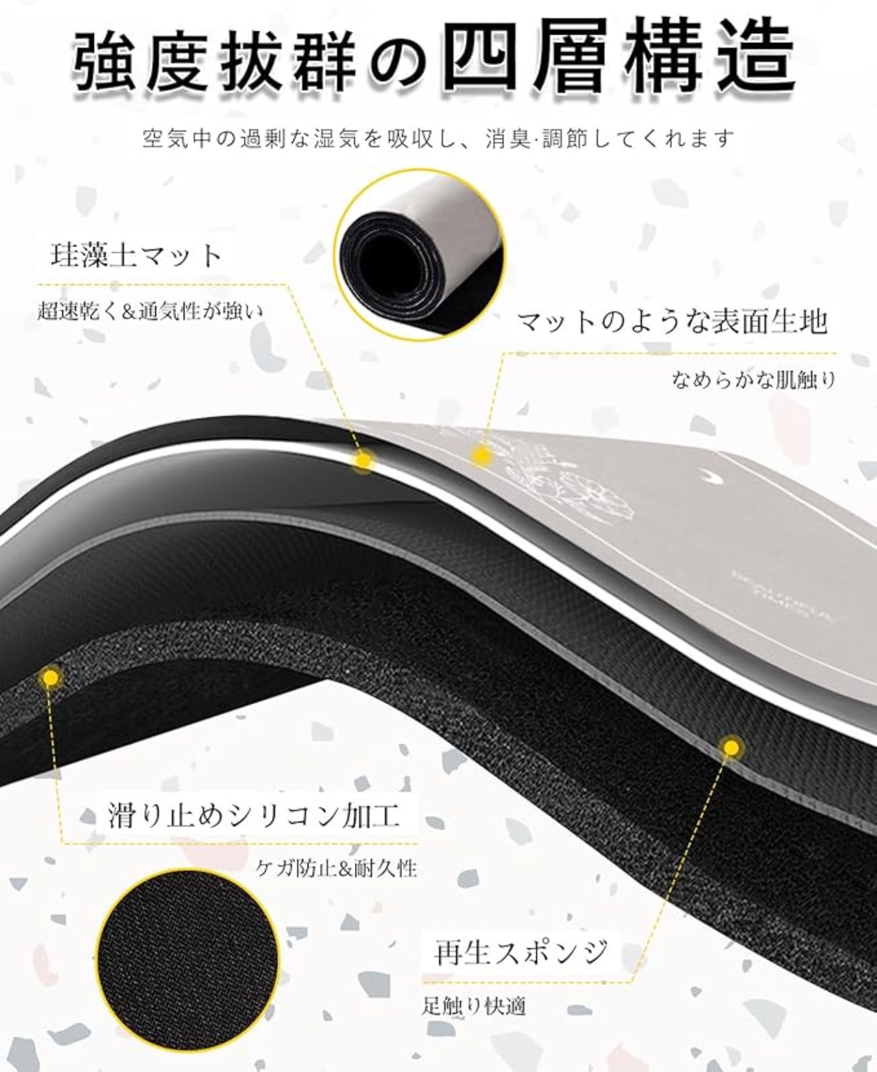 【商品仕様&四層構造】・サイズ:約60cm*40cm*0.4cm ・本体重量:約700g ・四層構造:1.超極細繊維透水層(毛髪がつかない)、2.珪藻土吸水層(吸水性抜群)、3.再生スポンジ(足触り快適)、4.滑り止めシリコン層(ケガ防止&耐久性)。従来の硬い珪藻土バスマットとは異なり、柔らかくてスポンジを踏むような感覚で、冷たさや割れる心配もありません。