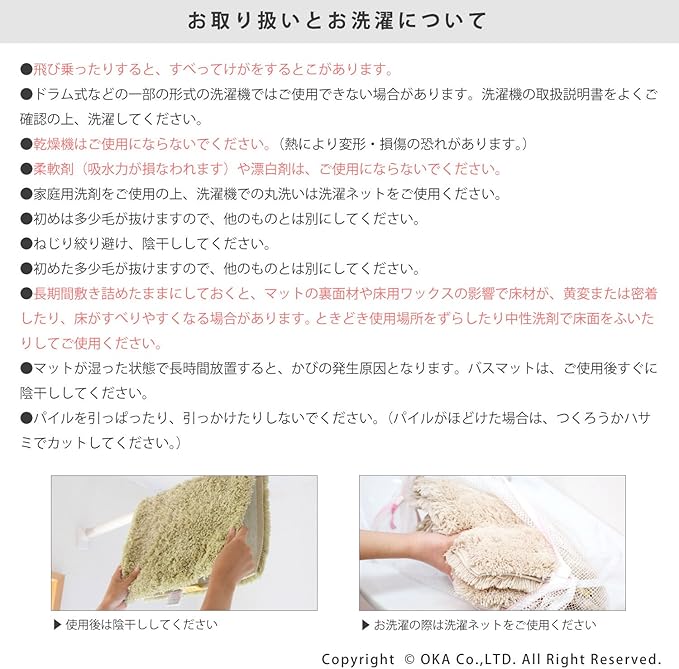 ●マットが湿った状態で長時間放置すると、かびの発生原因となります。ご使用後はすぐに陰干ししてください。