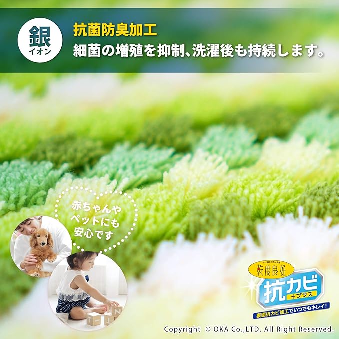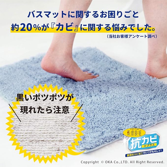 ●吸水・速乾の特殊吸水繊維であるオカ独自の「乾度良好」バスマットと抗カビ加工が一緒になって生まれた、今までにないバスマット「乾度良好 抗カビプラス」