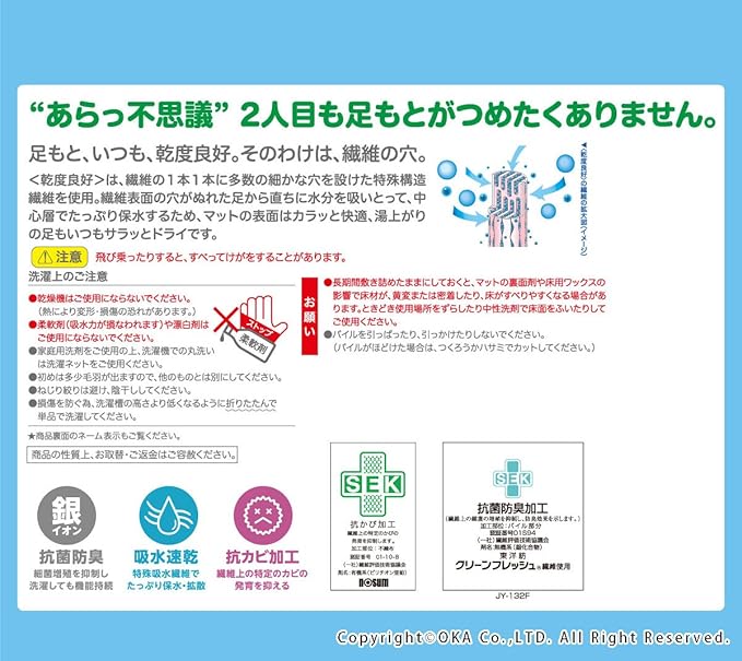 ●抗カビの加工の下地に、オカ独自の特殊吸水繊維「乾度良好」の糸を使用することで更に快適で清潔なバスライフをお楽しみ頂ける