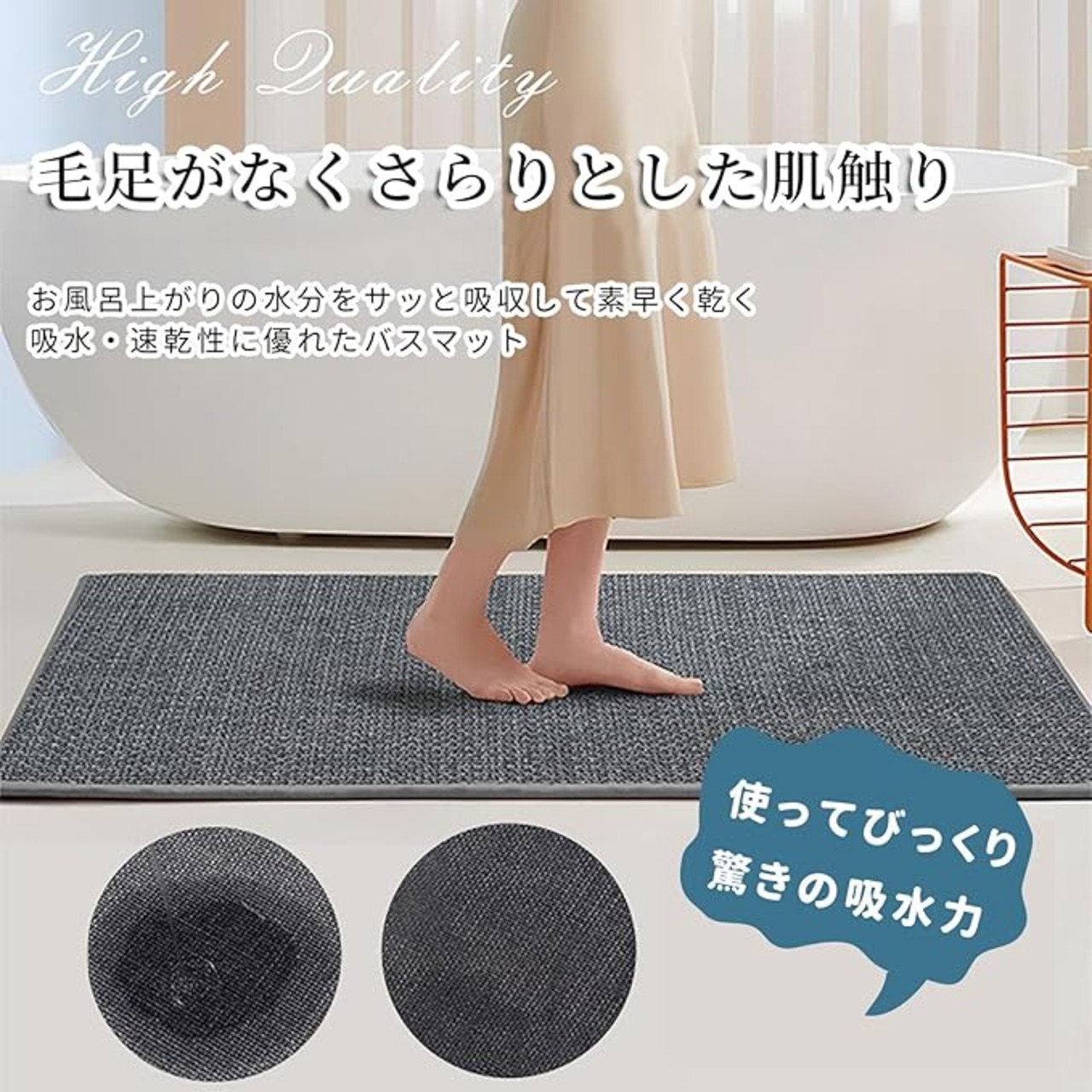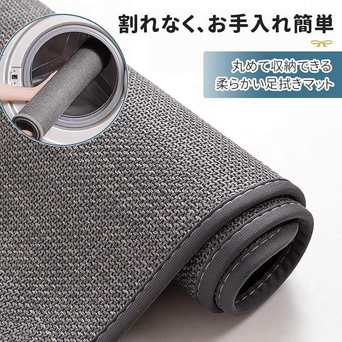 【吸水・速乾・滑り止め】表面は通気性が強くて、水分が急速に蒸発し、いつ踏んでも気持ちが良くなります。また、この吸水マットの裏面は滑りにくい天然ゴムを採用して、水が溜まりやすい場所に敷くことで、お年寄りや子どもの滑りや転倒を防ぐことができます。