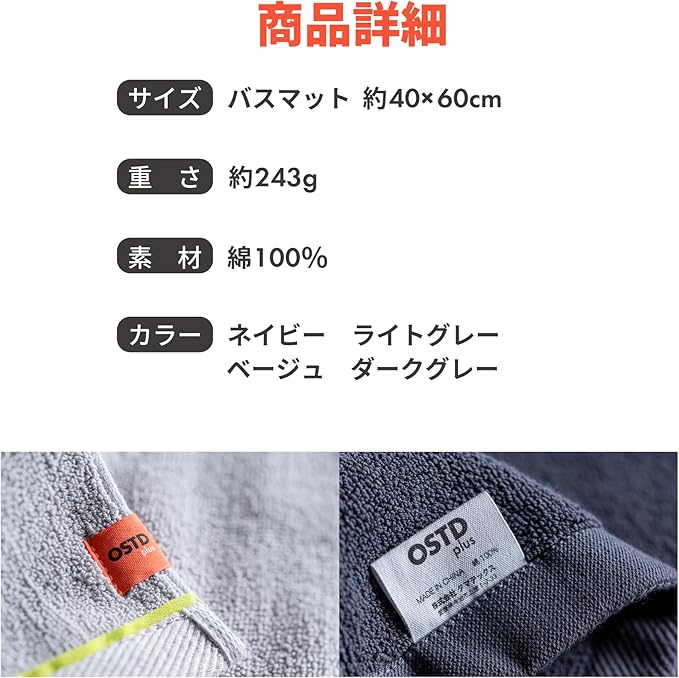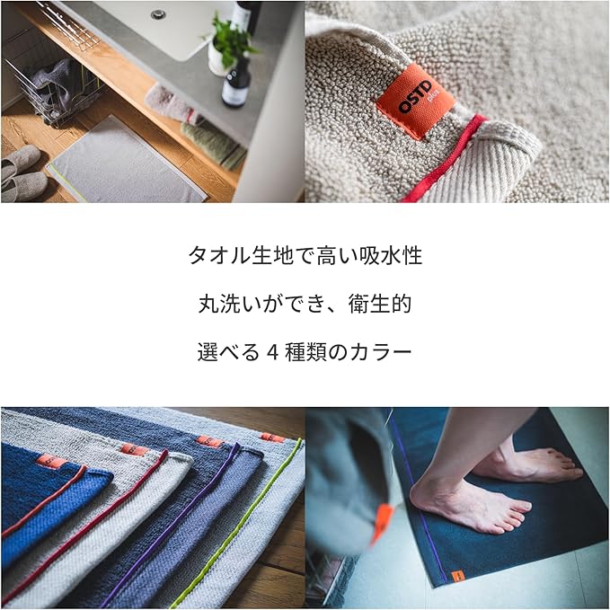【毎日の暮らしに快適さをプラスする1枚】洗面所や脱衣所での使用に最適な、タオル地のバスマット。しっかりと水分を吸収しながらもさらっと快適な踏み心地で、毎日のバスタイムをより心地よく演出します。タオルブランド「OSTD plus(オーエスティーディー プラス)」が手掛けるこのバスマットは、吸水性と速乾性に優れたタオル地素材を採用。清潔に保ちやすく、日常的な洗濯にも耐えられる丈夫さを備えています。どんなインテリアにも馴染むシンプルなデザインで、毎日使いたくなる1枚です。
