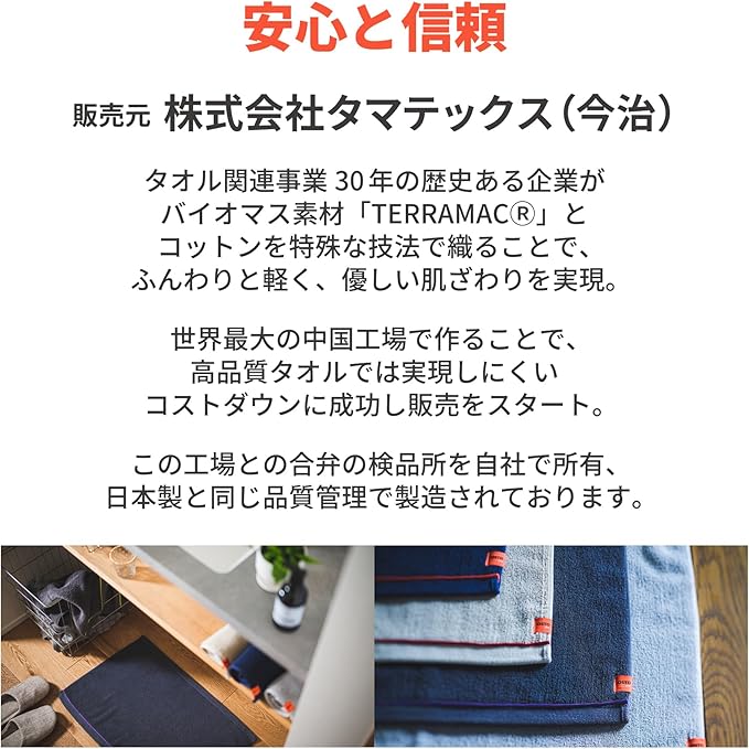 【グッドデザイン賞・サスティナブル】 バイオマス素材を活かしたサスティナブルな発想と、洗練されたデザイン性が評価され、2034年にはグッドデザイン賞でも注目されたOSTD(オーエスティーディー)タオル。バイオマス素材とコットンを組み合わせて紡いだ独自の糸は、染色工程でバイオマス素材が乳酸などに分解されることで空気のポケットが生まれます。その結果、糸と糸の間にたっぷりと空気を含み、軽やかでやさしい肌ざわりを実現しました。