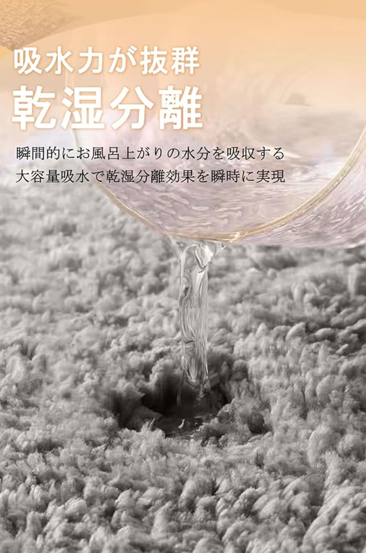 【1秒以内の驚異の吸水力】1秒以内の驚異の吸水力!表面の毛足が長く、水と接触する表面積が大きいので、お風呂上がりについた水滴も一瞬で吸収するから不快な冷たさが残りません。 充填材には独特の細かな孔構造により、空気が通りやすく、水分を素早く吸収し足元をすぐに乾燥させます。水回りの悩みはこのバスマット1枚でバッチリ解決。