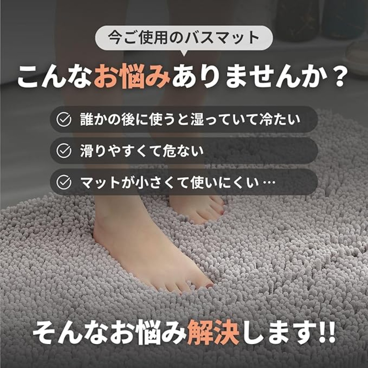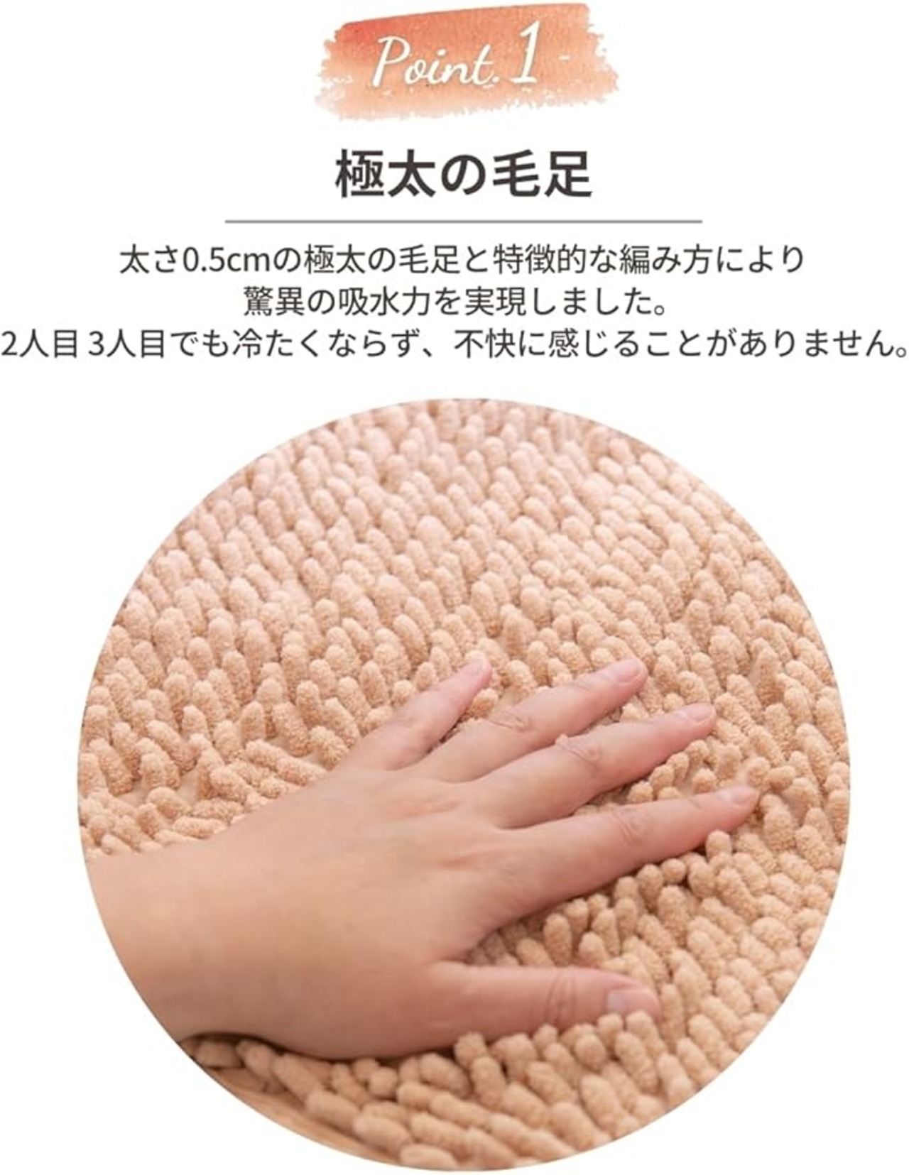 【バスマットの新常識】お風呂上がりの2人目、3人目でも、冷たく濡れたバスマットにがっかりすることはもうありません。本バスマットは、極太の毛足と特別な織り方を採用し、驚異的な吸収力を実現しました。家族全員が使っても、最後までサラサラで快適さが続きます。さらに、極太の毛足が生み出すふんわりとした足触りと抜群のクッション性で、贅沢な使用感をお楽しみいただけます。日常を少しだけ特別にするバスマットを、ぜひお試しください。