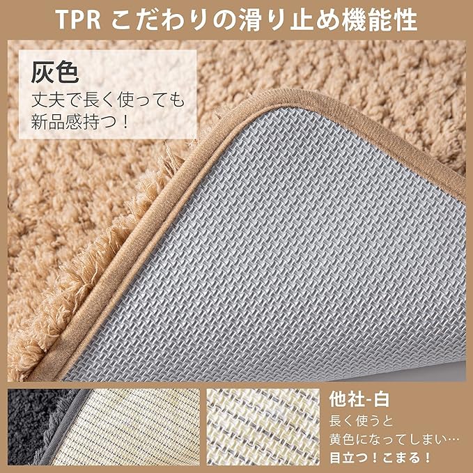 【自社開発!清潔感を持続しやすい灰色の滑り止め】裏面の滑り止めは「自社新開発」灰色TPR材質で、バスマットのズレや転倒を防止し、滑り止め機能性がよく、お年上やお子様などの安全をしっかりお守りします。灰色で他の白い滑り止めの商品より清潔感を持続しやすい、清潔で長く使っても褐色にならなく、よごれやシミを付けても目立たない、より地味でおしゃれ!