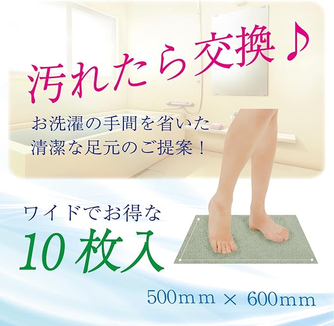 汚れたら交換できる使い捨てタイプの不織布バスマットです。 お洗濯の手間や時間を省いていつも清潔な足元を維持できます。 表面は吸水性の高い不織布を使い、裏面はラミネート加工した滑りにくい防水マットです。