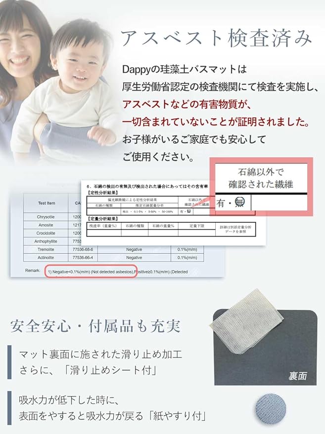 【アスベスト検査済み】日本の厚生労働省の認定機関で検査済みです。アスベストの検出は一切ございませんので、ご安心してご使用してください。