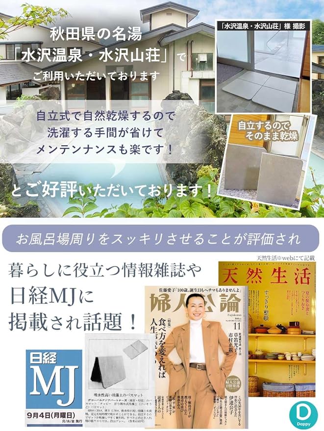【日経MJ・情報雑誌に掲載】【整理収納アドバザーが推薦】便利性が評価され、日経MJをはじめとするメディアに多数掲載!Dappyの珪藻土バスマットは折りたたむことができ2cmの隙間に収納ができます。デッドスペースを有効活用してきれいに収納!