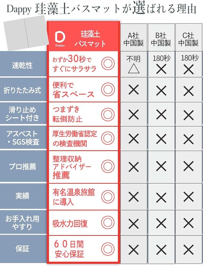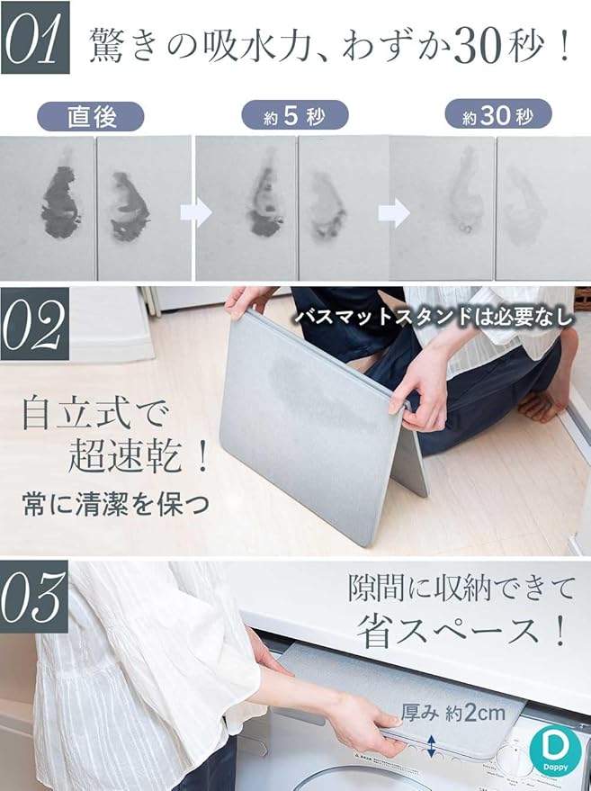 【吸水速乾】Dappyの珪藻土バスマットは吸水性が高い珪藻土を使用して、 踏んだ瞬間1秒で足の水分をすぐ吸収して、足元をサッと乾かしてくれます。 また、優れた速乾性により、カビや細菌の繁殖を抑えられます。