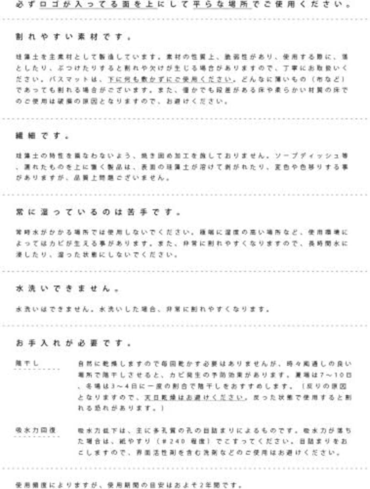 【ご注意】微量の粉が出てきますが、材質の特性上、自然に出てくるものですので品質上問題ございません。 ロゴが入っている面が表面になります。 浴室内には持ち込まないでください。 素材の劣化につながりますので、長時間水に浸さないでください。 時々風通しのよい場所で陰干ししてください(割れの原因になりますので、天日乾燥はお避けください) 床暖房での使用はお避けください。 使用後は、よく乾燥させてから保管してください。
