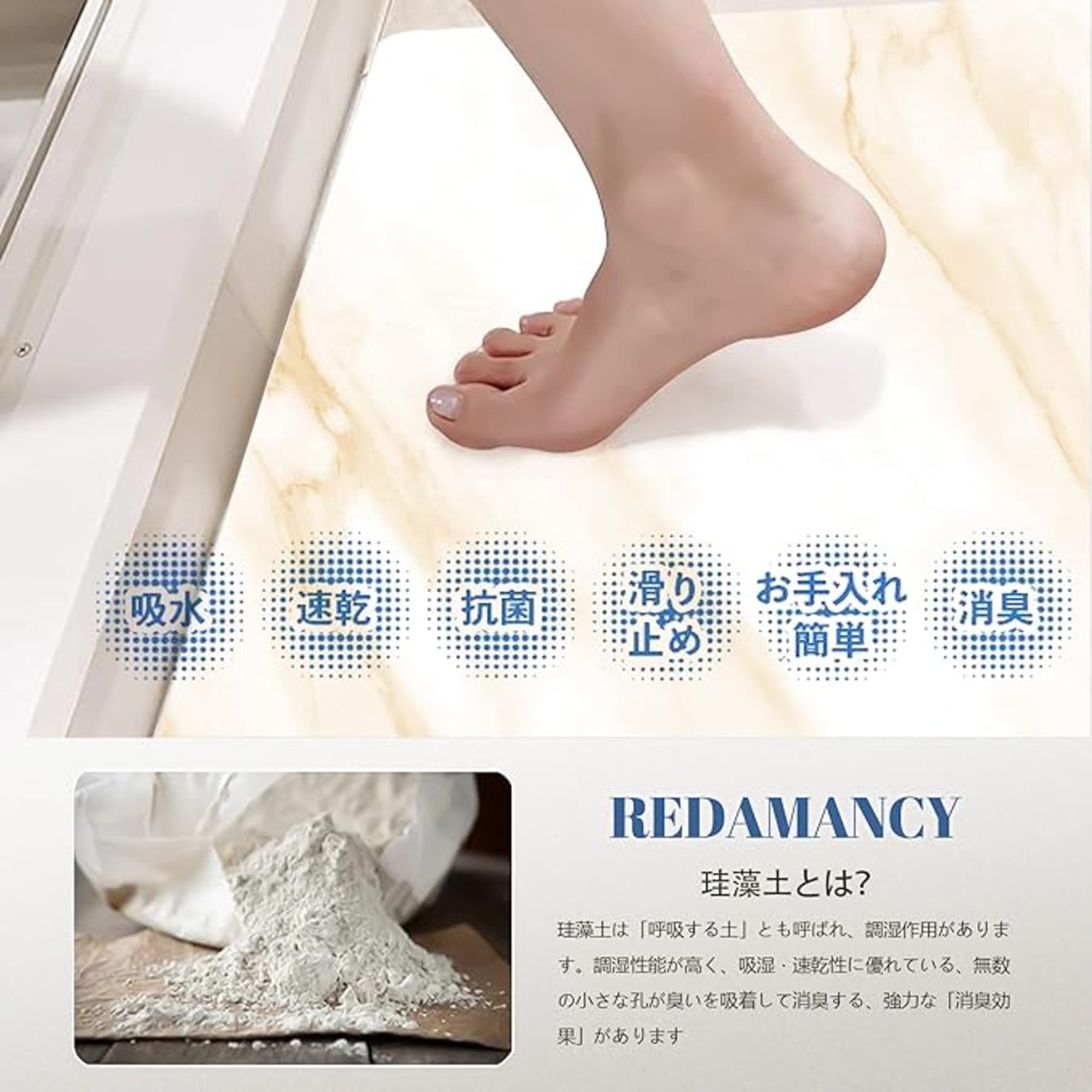 【抗菌・防臭・アスベストフリー】もちろん、家庭で使用する製品にも健康は欠かせません、マイクロファイバー製の珪藻土バスマットの表面は、細菌やほこりを吸着します、そのため、マットの第一層にPUレザーを使用しています、優れた透水性を維持しながら、ホコリや汚れ、髪の毛などをシャットアウトします。珪藻土は、強力な "消臭効果"、無数の小さな孔が臭いを吸着し、消臭します、で、乾燥状態を保ち、細菌、カビ、ダニの繁殖を抑制します、よりクリーンで健康的な環境づくり。