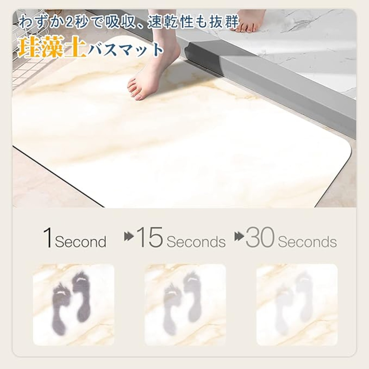 【2023 最新の珪藻土バスマット】進化した珪藻土バスマットは、従来の珪藻土バスマットに比べ、家族で使えるのが特徴、お風呂上りに、冷たくない柔らかなバスマットを踏んで足を拭くと、幸せな気分になり、体もリラックスして心地よくなります。柔らかい珪藻土のバスマットは、耐久性に優れ、壊れにくいのが特徴です。 新開発の珪藻土バスマットは、厚さわずか0.45cmでドアの開閉を妨げず、バスルームを美しく彩る実用的な装飾品のような役割を果たします。