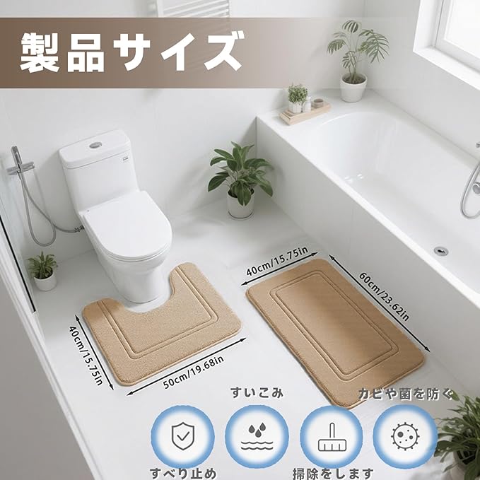 モダンデザインのバスマットセット:お風呂マットは 40 60cm + 40 50cm のサイズで、ベージュ・グレーなど色選択があります。モダンでシンプルなデザインは、トイレマットや洗面所マットとしてどんなインテリアにもマッチし、おしゃれな空間を演出します。
